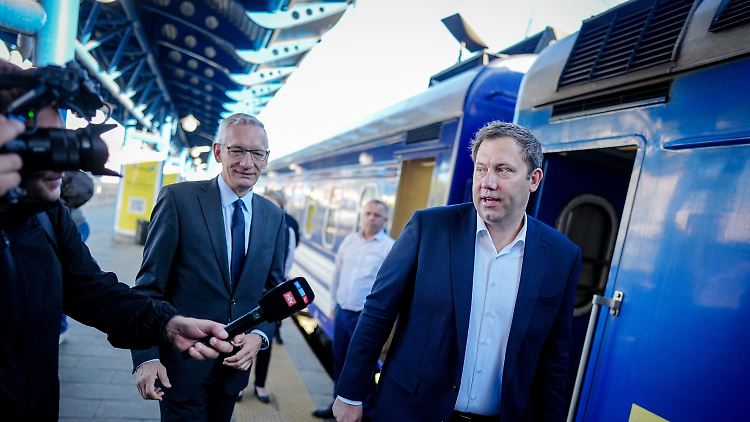 Der Vizekanzler kommt am Morgen mit dem Sonderzug in Kiew an und wird vom deutschen Botschafter in der Ukraine, Martin Jäger (l), begrüßt.
