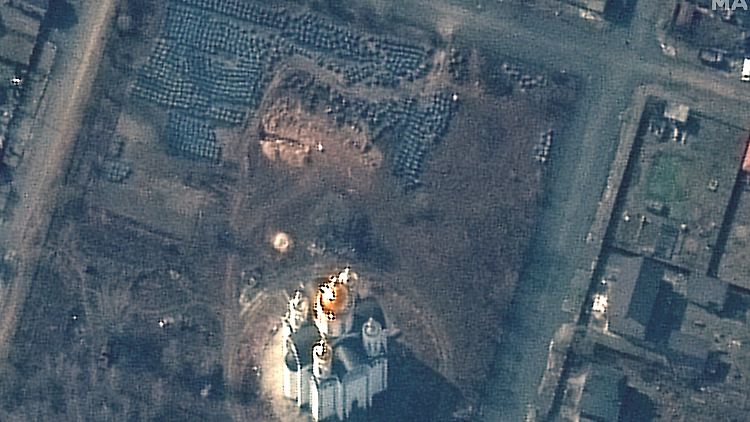 Satellitenbilder der Firma Maxar zeigen einen 14 Meter langen Graben auf dem Gelände einer Kirche in der ukrainischen Stadt Butscha - auf dem Bild ist ein heller Streifen etwas oberhalb der Kirche zu sehen. Dort wurden nach ukrainischen Angaben die Leichen Hunderter von russischen Truppen getöteter Zivilisten begraben.