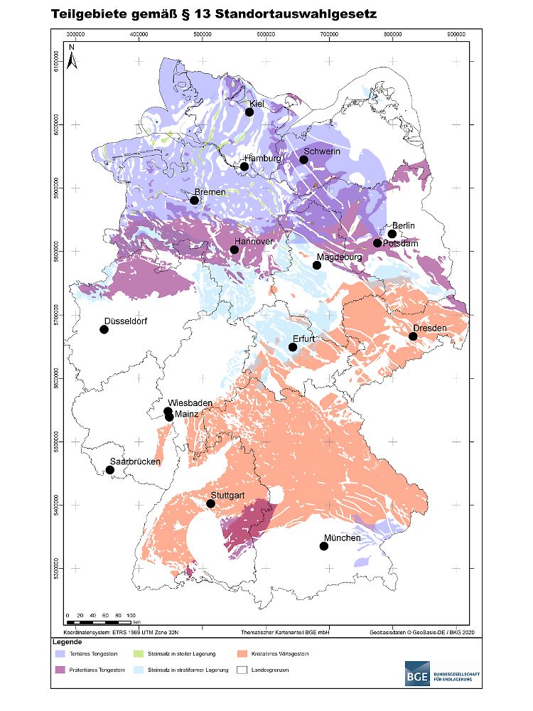 Berücksichtigt man die Überlagerung einiger Gebiete, ist laut Bericht in Deutschland ein Anteil von 54 Prozent der Landesfläche als Teilgebiet ausgewiesen. Teilgebiete liegen etwa in Bayern, Baden-Württemberg und Niedersachsen, aber auch in den ostdeutschen Ländern. Das Saarland, Teile von Mecklenburg-Vorpommern und Teile des Ruhrgebiets finden sich dagegen nicht darauf. Das Ruhrgebiet scheidet wegen der zahlreichen alten Bergwerke aus, die das Gebiet geologisch unsicher machen. Auf einer interaktiven Karte der BGE können die Gebiete im Detail betrachtet werden.
