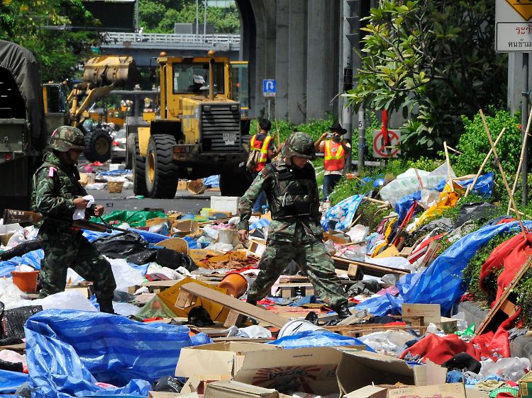 Mit einer Militäroffensive gegen die seit mehr als zwei Monaten in Bangkok demonstrierenden Rothemden hatte die Armee am Mittwoch das besetzte Stadtviertel geräumt. Enttäuschte Rothemden zogen anschließend durch die Straßen und setzten mindestens 35 Gebäude in Brand, darunter das mehrstöckige Einkaufszentrum Central World, das völlig ausbrannte und teilweise einstürzte.
