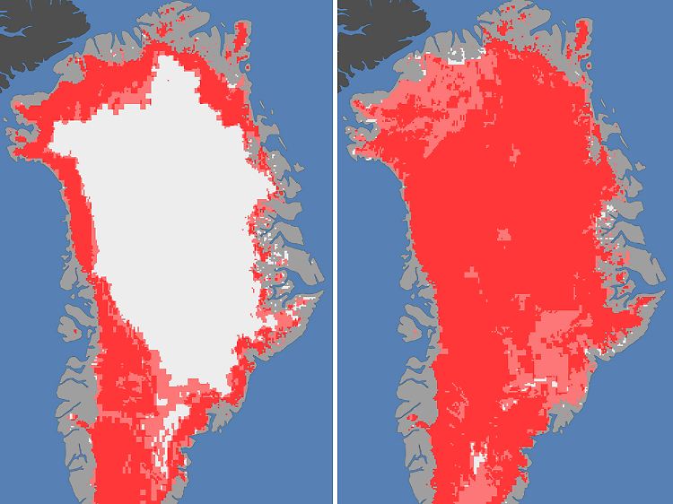 Das Meereis der Arktis in diesem Sommer so stark geschrumpft wie nie zuvor seit Beginn der Satellitenmessungen. Links eine Aufnahme vom 8. Juli, als das grönländische Meereis auf 40 Prozent der Fläche schmilzt. Rechts ein Bild vom 12. Juli - auf ungefähr 97 Prozent der Fläche schmilzt das Eis.