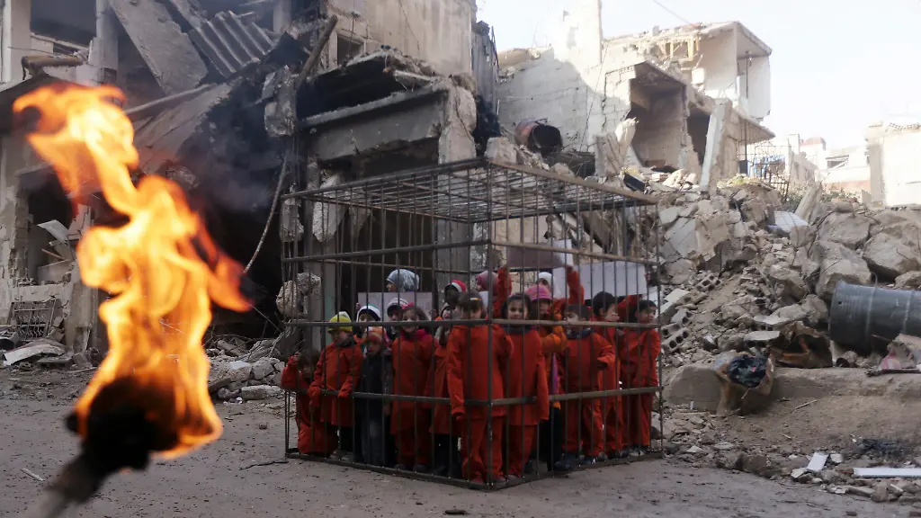 Es ist ein verstörendes Bild, das zunächst in die Irre leitet. Jungen und Mädchen, nicht älter als zehn Jahre, stehen eingepfercht in einem Käfig. Sie tragen orangefarbene Anzüge - wie die Geiseln der radikal-islamischen Terrormiliz Islamischer Staat. Im Vordergrund des Fotos ist eine brennende Fackel zu sehen. Sofort werden Erinnerungen an die grausame Hinrichtung des jordanischen Piloten Muaz al-Kasasbeh wach. Der 26-Jährige ist vor einigen Wochen von IS-Kämpfern in Syrien lebendig verbrannt worden. Die Hinrichtung wurde per Video über das Internet verbreitet.