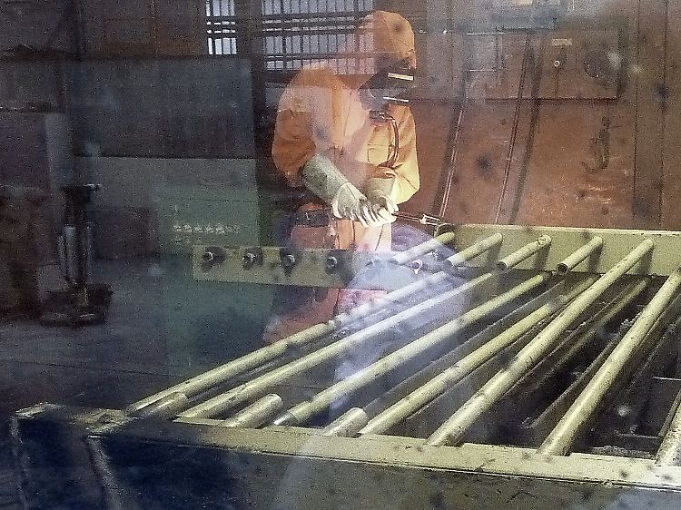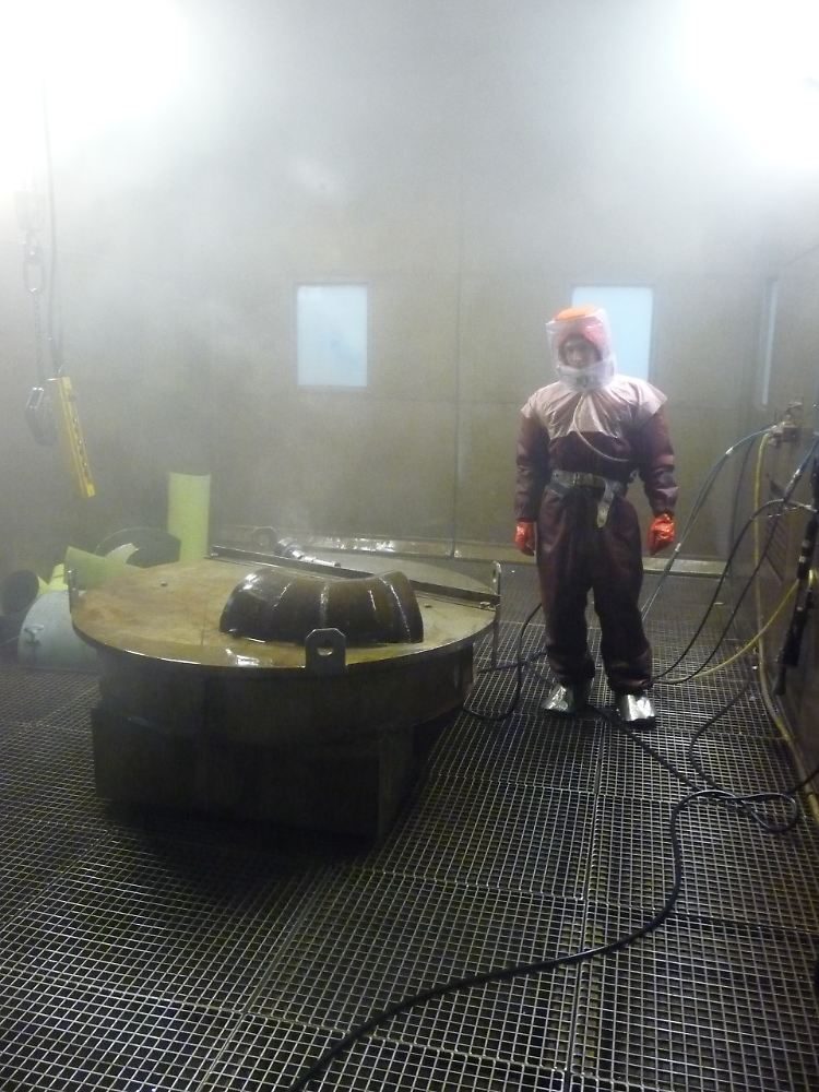 Dekontaminiert wird chemisch oder mechanisch. In der chemischen Dekontamination stehen drei Wannen, zwei mit Phosphorsäure, eine mit Oxalsäure, für die elektrolytische Säuberung. In diesen Becken wird die Oberfläche der AKW-Reste abgelöst, ein Kran hebt sie hinein. Viel härter dagegen ist die Arbeit bei der mechanischen Dekontamination. In der Trockenstrahlanlage schießt ein Arbeiter mit Stahlkies. Durch ein kleines Fenster kann man ihn beobachten, in seinem Schutzanzug sieht er aus wie ein Stahlkocher. Die dicken Scheiben einer weiteren Kammer sind beschlagen. Mit 2000 Bar beschießt ein junger Mann ein Stück Altmetall mit Wasser. Auf die Frage, ob ihm das Spaß macht, nickt er und grinst breit. Die Frage, ob er sich Sorgen um seine Gesundheit macht, geht vielleicht im Lärm unter. Jedenfalls beantwortet er sie nicht. Das, was er mit seinem Hochdruckreiniger entfernt, landet als grau-braune Schlacke in gelben Fässern. "Es dauert ein bis zwei Wochen, bis so ein Fass voll ist", sagt Philipp. Und warnt: "Da gehen Sie jetzt besser nicht zu nah ran."