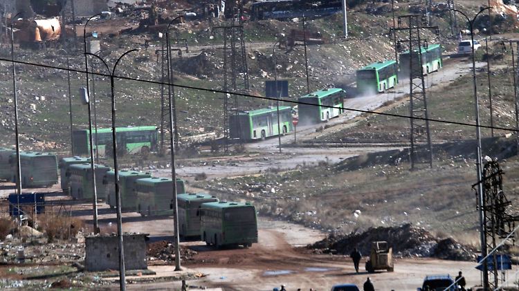 In ersten Berichten hatte es noch geheißen, den Tag über würden voraussichtlich rund 15.000 Menschen aus den Rebellengebieten abtransportiert. Sie sollten in die Oppositionshochburg Idlib gebracht werden.