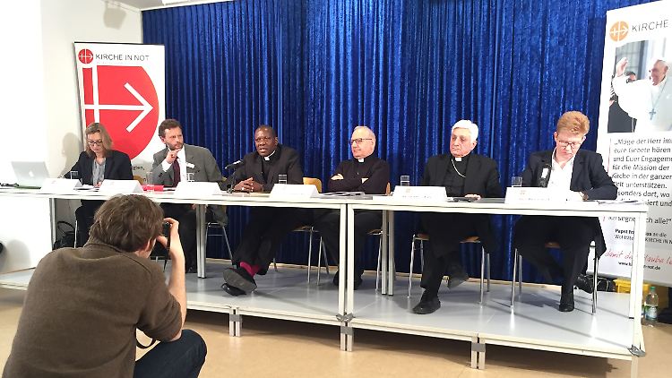 Antoine Audo, chaldäisch-katholischer Bischof in Aleppo (2. v.R.), berichtet bei einer Pressekonferenz in München von seinen Erlebnissen in Syrien.