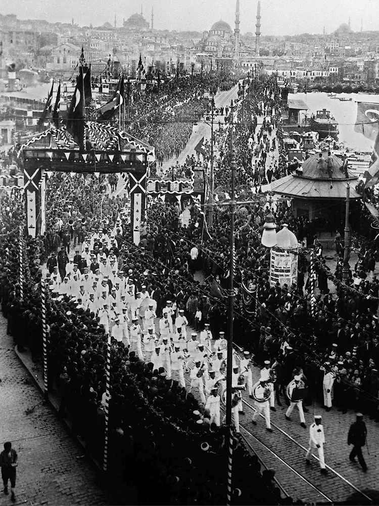 Türkische Truppen marschieren im Oktober 1923 über die Istanbuler Galata-Brücke.
