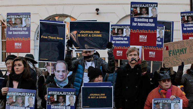 London, 29. Dezember: Journalisten und Menschenrechtler protestieren in London dagegen, dass drei Al-Dschasira-Mitarbeiter in Ägypten seit einem Jahr in Haft sind.