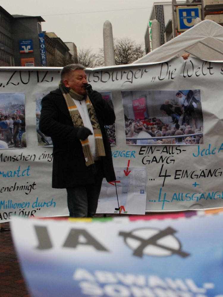 Kämpfen muss er – schon seit eineinhalb Jahren. Gegen abschätzende Blicke beim Philharmonie-Konzert, gegen Pfiffe und Schmähungen beim Fußball-Stadtpokal, dessen Schirmherr er ist. Da wo der Oberbürgermeister seine CDU hinter sich versammelt, sammelt das "Duisburger Bündnis Abwahl" die Stimmen der aufgebrachten Bürger – in der Fußgängerzone, in jedem Stadtbezirk, im Internet. "Unmoralisch" findet Theo Steegmann Sauerlands Verhalten. Der Sprecher des Abwahlbündnisses ist "fassungslos, wie die CDU zum Schaden der Stadt einfach weiterregieren kann." Von einem "Scherbenhaufen" und "Gewürge" spricht er im Bezug auf die politische Lage Duisburgs. "Erst mal muss Sauerland weg!", fordert Steegmann mit lauter werdender Stimme.