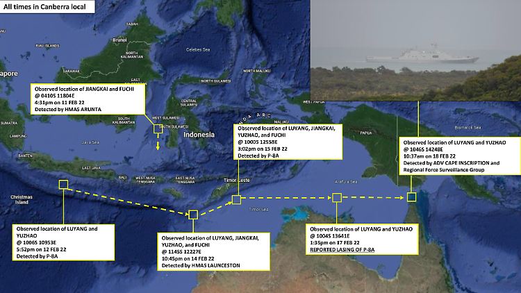 Das australische Verteidigungsministerium veröffentlichte auf seiner Webseite eine Erklärung und mehrere Bilder von dem Vorfall. Darauf sind die beiden Schiffe der chinesischen Marine zu sehen und der Kurs, auf dem sie in den vergangenen Tagen unterwegs waren. Demnach wurden sie am 11. Februar südlich der indonesischen Java-Insel erfasst. Sechs Tage später kam es zum Laser-Vorfall in der Arafurasee. Anschließend setzen sie ihren Kurs gen Osten fort und fuhren durch die Torres-Straße in das Korallenmeer.