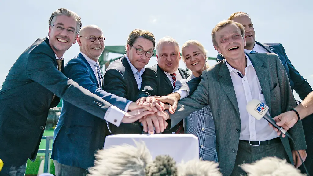 Die Saugbagger sind bei der Arbeit: Bundesverkehrsminister Andreas Scheuer und Vertreter des Hamburger Senats und der Wirtschaft haben mit einem Knopfdruck das symbolische Startsignal für die Vertiefung der Fahrrinne zum Hafen gegeben. Daraufhin senkte sich der Saugrüssel des Baggerschiffs "Scheldt River" in die Elbe und begann mit der Arbeit.