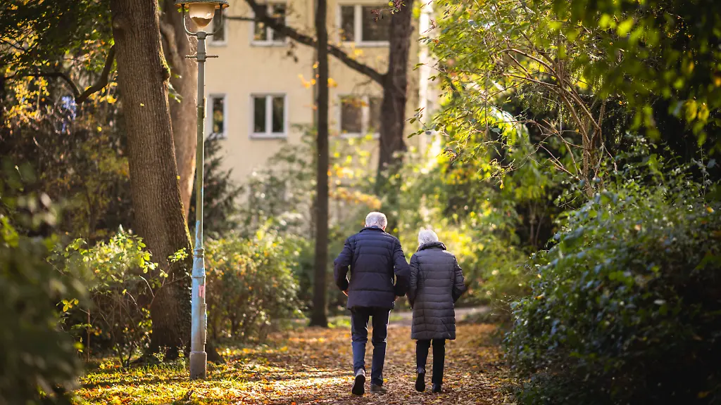 Ein-Senior-und-eine-Seniorin-machen-in-der-morgendlichen-Sonne-einen-Spaziergang-durch-einen-Park-aufgenommen-in-Berlin-20-10-2025