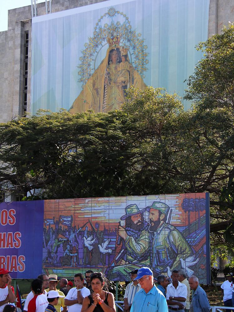 Kubas Präsident Raúl Castro saß in der ersten Reihe. Gegen Ende des Gottesdienstes wurde er zum Altar gebeten, wo er und der Papst sich unter dem Applaus der Menge die Hände schüttelten. Die Messe zeigte noch einmal, in welchem Spannungsfeld die Reise stattfand: Geschmückt war der Platz der Revolution mit Porträts von Ernesto Che Guevara und Camillo Cienfuegos, Helden der Revolution von 1959. Ein großes Plakat zeigte zudem die Barmherzige Jungfrau von El Cobre, die Schutzpatronin Kubas, deren Holzfigur Fischer der Überlieferung nach vor 400 Jahren fanden.