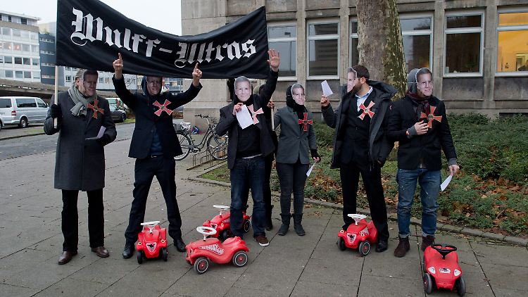 Zu Beginn sorgte eine Spaßaktion vor dem Gerichtsgebäude für Aufsehen: Dort tummelten sich sieben Unbekannte mit Christian-Wulff-Gesichtsmasken, Bobbycars und riesigen Bundesverdienstkreuzen am Revers, bis sie von Justizbeamten auf die andere Straßenseite verwiesen wurden. Sie trugen ein Transparent mit der Aufschrift "Christian-Wulff-Ultras" und skandierten "Christian Wulff ist kein Verbrecher".