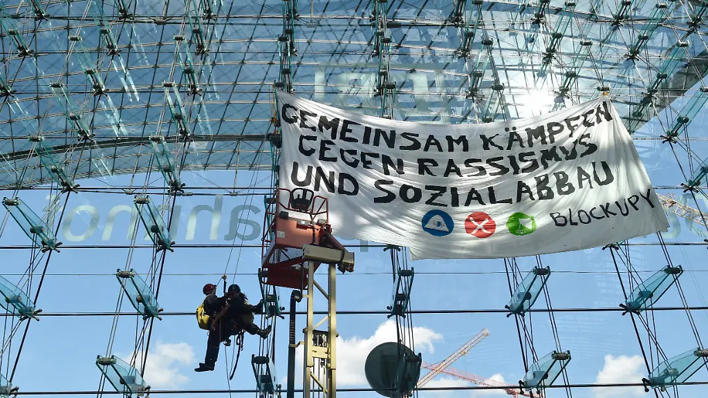 Die Bundespolizei nahm nach eigenen Angaben am Vormittag zwei Blockupy-Aktivisten fest, die die Glasfassade des Berliner Hauptbahnhofes empor geklettert waren, um dort ein Transparent zu entfalten. Der 25-jährige Mann und die 23-jährige Frau seien Aufforderungen zur Beendigung der Aktion nicht nachgekommen, weshalb spezialisierte Beamte eingesetzt worden seien.