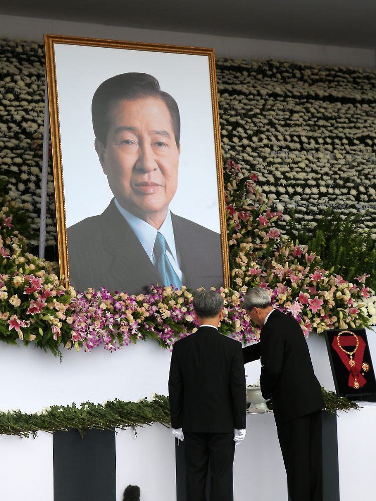 Die Beisetzungsfeierlichkeiten für Kim, zu denen auch zahlreiche ausländische Politiker und Würdenträger nach Seoul gereist waren, fanden vor dem Parlamentsgebäude statt, um an Kims Beitrag zur Demokratie in Südkorea zu erinnern. Trauernde hatten zum Gedenken an den Verstorbenen gelbe Bänder an den Haupteingang des Komplexes geheftet. Ein großes, von Blumen umgebenes Porträt Kims war auf einem Trauerschrein zu sehen. Etwa 24.000 Menschen verfolgten die Zeremonie. Anschließend sollte der Sarg begleitet von einer Motorradeskorte zum Friedhof gebracht und beigesetzt werden. In Südkorea herrscht eine sechstägige Staatstrauer.