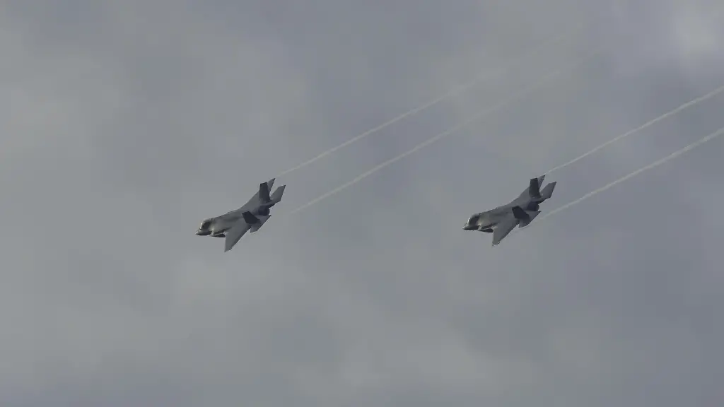 Lockheed-Martin-F-35-Lightning-II-Kampfflugzeug-zwei-Militaerflugzeuge-der-amerikanischen-Luftwaffe-USAF-im-Flug-auf-dem-Luftwaffenstuetzpunkt-RAF-Lakenheath-Suffolk-England-Grossbritannien