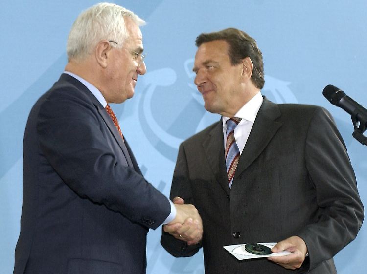 Peter Hartz überreicht Bundeskanzler Gerhard Schröder am 16. August 2002 das umstrittene Reformkonzept seiner Kommission.