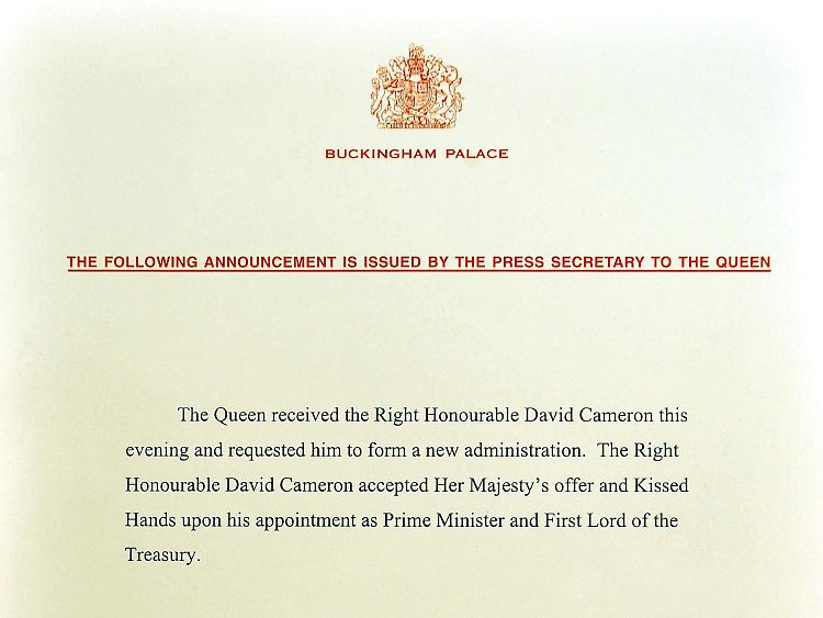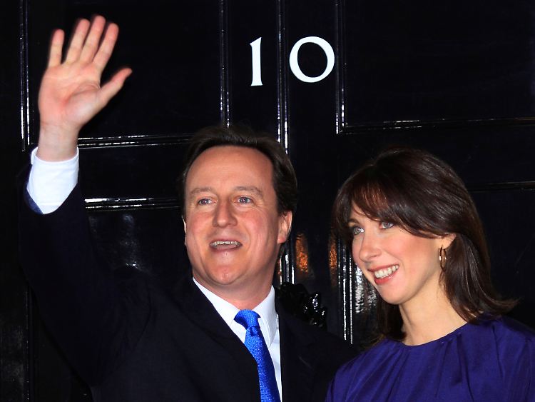 Zusammen mit seiner Frau Samantha fuhr Cameron nach der Unterredung mit der Königin vom Buckingham Palast zur Downing Street. Dort kündigte er an, zusammen mit den Liberaldemokraten und deren Chef Nick Clegg eine Koalition zu bilden. Er wolle eine "echte und vollständige Koalition", sagte der Chef der Konservativen und machte damit deutlich, dass er keine von den Lib Dems tolerierte Minderheitsregierung plane. Großbritannien bekommt erstmals seit etwa sieben Jahrzehnten eine Koalitionsregierung.