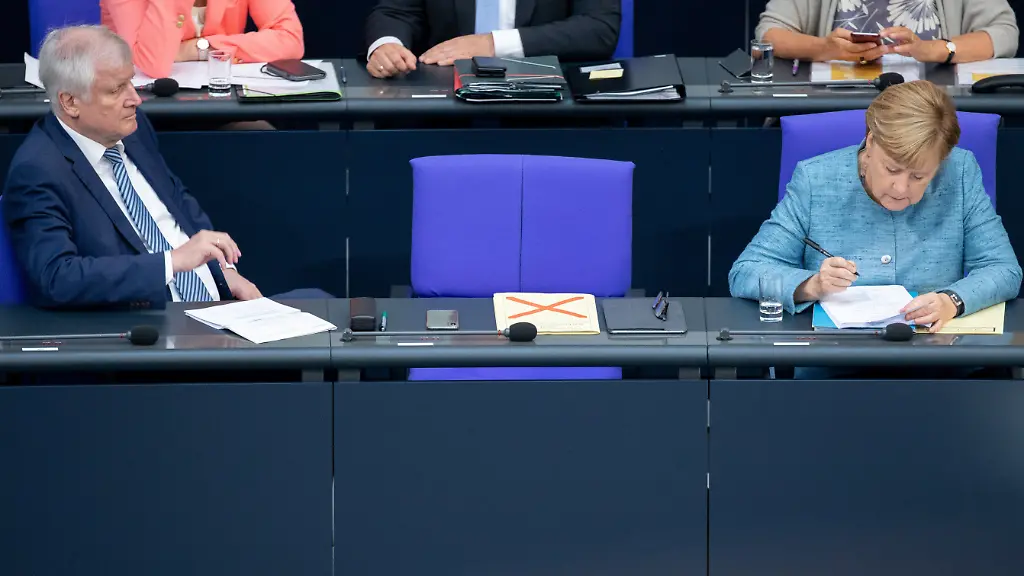 Zu Anfang der Debatte ist das Plenum noch verhältnismäßig gut gefüllt, im späteren Verlauf des Nachmittags lichten sich die Reihen jedoch deutlich. Viele Abgeordnete scheinen außerdem mit einem anderen Thema als dem Haushalt beschäftigt zu sein. Auf vielen Tischen liegen Presseberichte, die Namen des Verfassungschutz-Chefs Hans-Georg Maaßen und des Innenministers Horst Seehofer sind in den Überschriften zu lesen. Wiederholt sind ranghohe Unionspolitiker zu beobachten, die sich in den hinteren Bänken in Vieraugengesprächen austauschen. Merkel ist ebenfalls viel im Plenum unterwegs, geht zweimal zu SPD-Chefin Andrea Nahles, tauscht sich mit ihrem Widersacher, Innenminister Horst Seehofer, aus. Offenbar wird der morgige Tag vorbereitet. Dann hält die Regierungschefin in der Generaldebatte eine Rede im Bundestag. Dabei muss sie erwarten, wegen der widersprüchlichen Deutungen der Ereignisse in Chemnitz massiv von der Opposition kritisiert zu werden. Von ihr wiederum wird nicht weniger erwartet, als dass sie klare Worte in Bezug auf Seehofer und Maaßen findet.