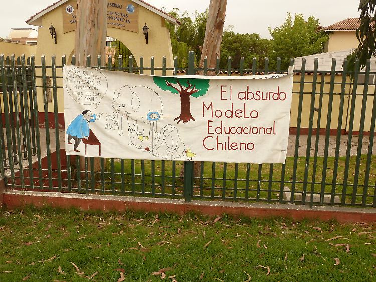 Am Gebäude der Universidad de Chile, an der Ost-West-Verkehrsachse der Hauptstadt, hängt ein riesiges Spruchband. Es mahnt die Vorbeifahrenden: "Der Kampf wird von der ganzen Gesellschaft geführt. Alles für eine unentgeltliche Bildung." In keinem Industrieland auf der Welt ist der Weg zum Abschluss in Relation zum Durchschnittseinkommen teurer. Studiengebühren sind normal, private Hochschulen werben auf riesigen elektronischen Tafeln um neue "Kunden".