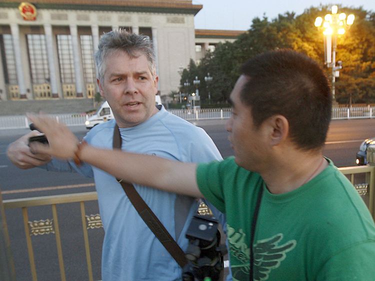 Ein chinesischer Polizist in zivil (r) versucht die Kamera eines Journalisten auf dem Tian'anmen-Platz zu greifen.