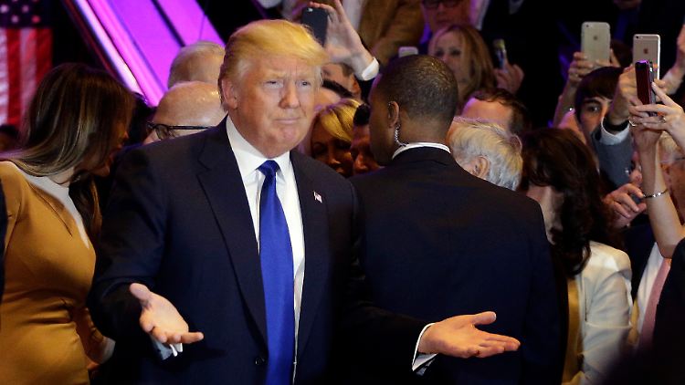 Rund eine halbe Stunde nach der ersten Hochrechnung trat dieser ans Rednerpult in seinem "Trump Tower" an der Fifth Avenue. Umringt von Anhängern im Anzug und jungen Damen in Abendkleidern rief er seine Siegesbotschaft in die Stadt hinaus. "Die Menschen in New York haben Probleme wie die Menschen im ganzen Land", so der 69-Jährige. "Die Jobs werden aus dem Land gesaugt und wir werden das nicht weiter zulassen." Wie üblich sagte er nicht, wie er das hinkriegen wolle. Er versprach lediglich "unglaubliche Handelsabkommen", die die Arbeitsplätze zurück ins Land bringen sollen. Seine zweite Botschaft: Nur er könne Kandidat der Republikaner werden, weil er die meisten Stimmen hole. "Niemand kann uns die Wahl wieder wegnehmen!", rief er und meinte damit den Parteitag in drei Monaten. Das Wahlsystem schimpfte er "verlogen und manipuliert".