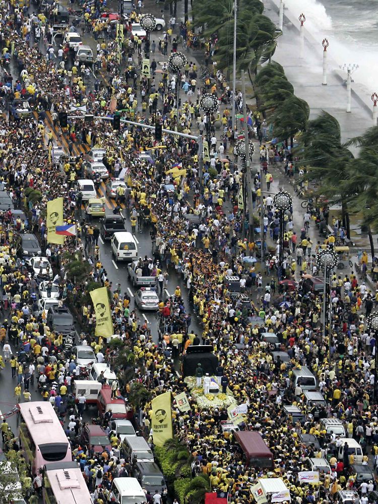 Tausende Menschen säumten die Straßen entlang der 20 Kilometer langen Strecke von der Kathedrale der Hauptstadt zur letzten Ruhestätte, als der kilometerlange Trauerzug mit dem in die Nationalflagge gehüllten Sarg Aquinos passierte. Die 76-Jährige war am Samstag nach langer Krebserkrankung gestorben. "Cory, Cory, Cory", skandierten die Menschen. Viele trugen gelbe T-Shirts, Luftballons und Bänder, die Farbe von Aquinos politischer Bewegung. Der Verkehr kam streckenweise zum Erliegen, auch der Trauerzug musste wegen der großen Menschenmassen mehrfach stoppen.