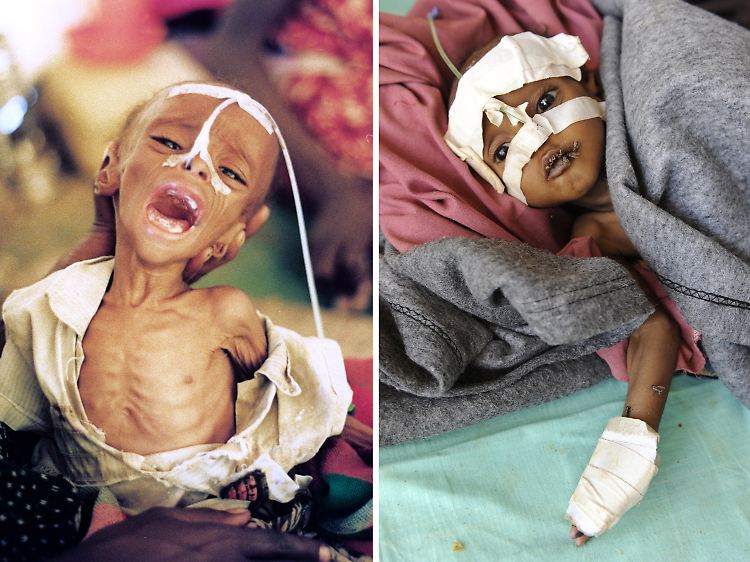 Der Hunger ist immer noch da: Die Bildkombo zeigt ein Kleinkind, das bei einer Hungerkatastrophe 1991 im äthiopischen Flüchtlingslager Doronaji künstlich ernährt (l) und ein somalisches Kind, das bei der aktuellen Hungerkatastrophe im Flüchtlingslager Dadaab in Kenia medizinisch versorgt wird.