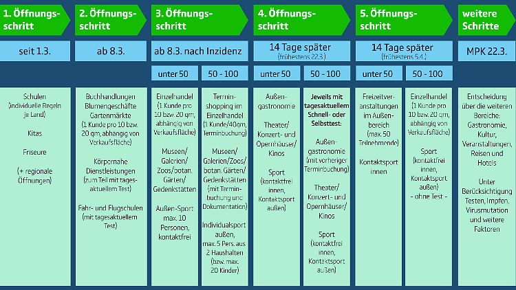 Wäre alles nach Plan gegangen, hätten Ministerpräsidenten und Kanzlerin ihr Versprechen eingehalten - zumindest fast, denn vor den weiterführenden Schulen öffneten erst einmal Gartencenter, Baumärkte und was sonst noch alles wichtig schien. Am 3. März beschloss die Bund-Länder-Runde dann einen Corona-Stufenplan, in dem die Schulen tatsächlich an erster Stelle genannt wurden - wenn auch wiederum gemeinsam mit den Friseuren. Dummerweise gab es noch nicht genügend Tests, um die Testkonzepte umzusetzen, mit denen die Länder diese Öffnungen sicherstellen sollten.