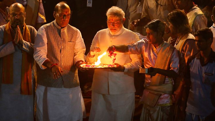 Am Tag nach seinem überragenden Wahlsieg ist Indiens designierter Premierminister Narendra Modi auf seiner Dankesreise mit Jubel, Tanz und Ehrerbietungen empfangen worden. In der Stadt Varanasi betete er am heiligen Fluss Ganges. Seine hindu-nationalistische Partei BJP hatte sich bei der Parlamentswahl allein die absolute Mehrheit gesichert und kann damit sogar ohne Bündnispartner regieren.