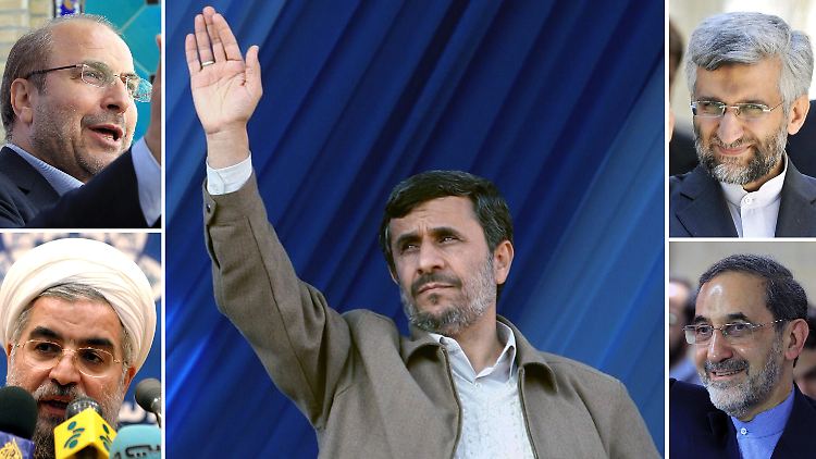 Präsident Achmedinedschad und die aussichtsreichsten Kandidaten: Mohammad-Bagher Ghalibaf (o.l.) ist amtierender Bürgermeister in Teheran, Hassan Ruhani (u.l.) ist Chefunterhändler des Iran im Atom-Streit, Saeed Dschalili (o.r.) ist Vorsitzender des Obersten nationalen Sicherheitsrats des Iran, und Ali-Akbar Welajati (u.r.) ist ehemaliger Außenminister des Iran.