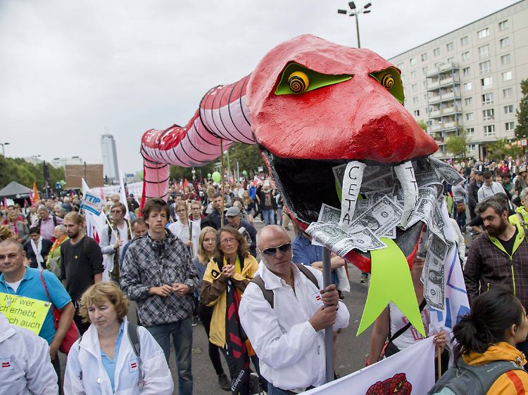Unter dem Motto "Für einen gerechten Welthandel. Ceta und TTIP verhindern" kommen in Berlin etwa 70.000 Menschen zusammen, in sechs weiteren Großstädten werden ebenfalls Zehntausende Teilnehmer gezählt.