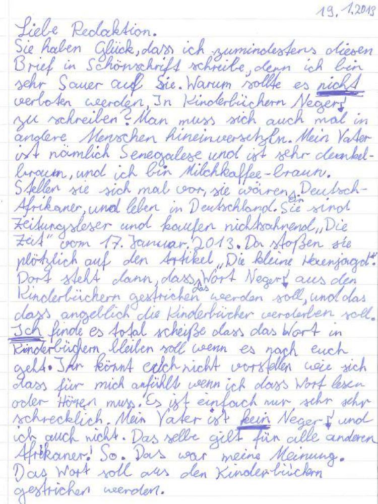 In einem Leserbrief erklärte eine Neunjährige der Wochenzeitung "Die Zeit", warum es verletzend ist, "Neger" genannt zu werden.