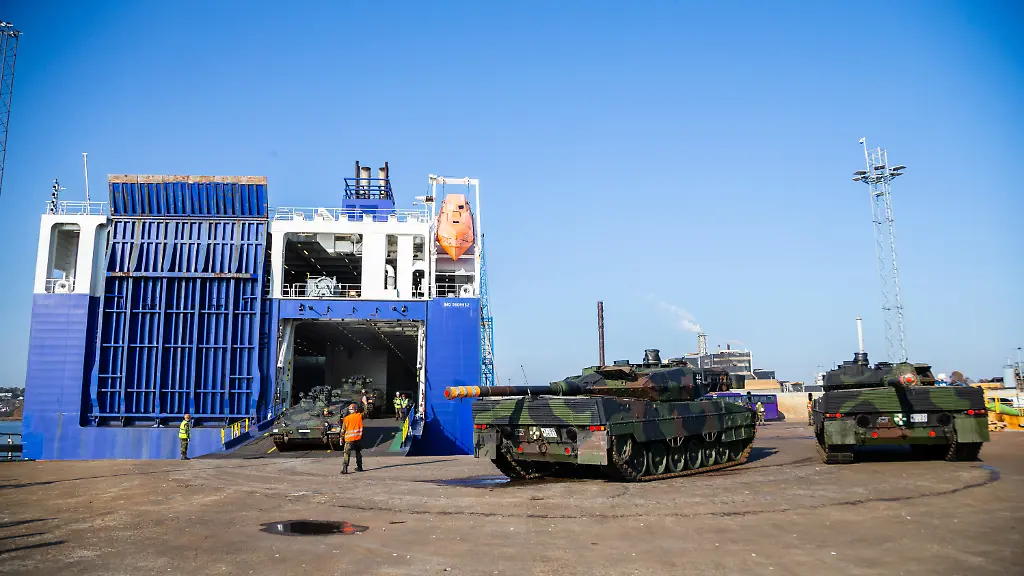 Dutzende deutsche Panzer und andere Militärfahrzeuge rollen unter ohrenbetäubendem Motorenlärm aus dem Bauch des riesigen Transportschiffes "Ark Germania", das am Mittwochmorgen in Emden gestartet war. Unter ihnen sind Schützenpanzer vom Typ "Marder", Bergepanzer vom Typ "Büffel" und schließlich auch Kampfpanzer vom Typ "Leopard 2A6".