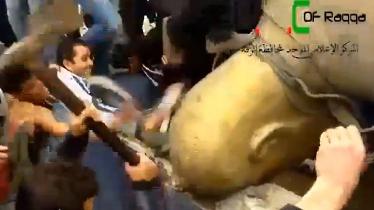 Der Screenshot eines Videos zeigt, wie Menschen in Raka die Statue des Vaters von Machthaber Assad zerstören.