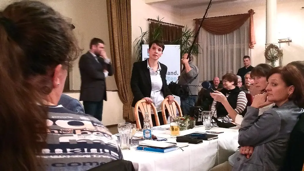 Dann betritt Frauke Petry mit ihrer Entourage den Saal. Die Gemütlichkeit der Gaststätte, die verbrauchte Luft, Biergläser, Schnitzel, Zwiebelsuppen. Petry kann nicht mehr auf den großen Bühnen der AfD um Anhänger werben. Sie muss wieder im ganz kleinen Maßstab anfangen. Auf zwei Aufstellern hinter ihr steht "Blaue Wende", "Deutschland gestalten" und "Bürgerforum". Die Mikrofonanlage funktioniert nicht. Ihr Mitstreiter und Landtagsabgeordnete Uwe Wurlitzer schlägt mit einem Messer gegen ein Bierglas. Petry begrüßt ihre Gäste.