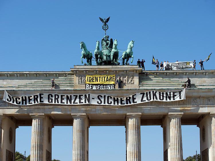 Ihre spektakulärste Aktion gelang ihnen Ende August 2016, als sie das Brandenburger Tor in Berlin erklommen. Neben der Quadriga schwenkten sie ihre schwarze Fahne mit dem griechischen Buchstaben Lambda - ein Symbol für den Kampf gegen angebliche Invasoren -, entrollten ein Banner "Grenzen schützen. Leben retten". Fast wie Greenpeace einige Jahre zuvor, nur mit anderen Parolen. Linke Agitationsmethoden seien ja nicht urheberrechtlich geschützt, sagt Fiß dazu. Kaum sind die Aktionen beendet, sind die Videos davon auch schon auf Youtube zu sehen.