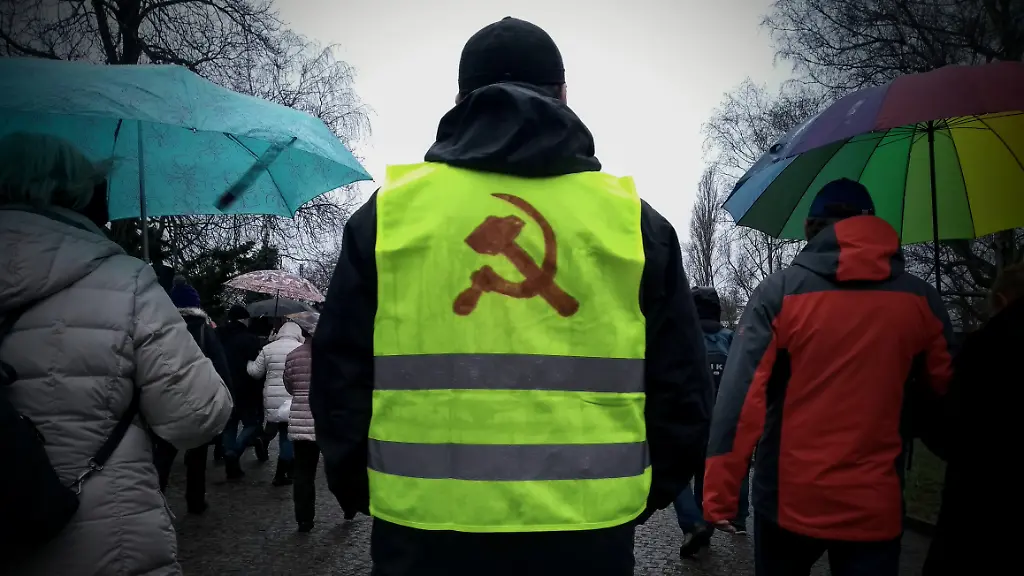 Je weiter der Protestzug vorbeizieht, desto drastischer werden Symbole und Parolen. Ein Wagen der Deutschen Kommunistischen Partei (DKP) rollt heran. Durch Megafone wird gefordert, den Sozialismus in Kuba zu unterstützen. "Viva Cuba Socialista!" Das EU-Parlament wird als "Aushängeschild des kapitalistischen Systems EU", als "Feigenblatt" bezeichnet. Besetzen will es die DKP nach der kommenden Europawahl freilich dennoch und nutzt den Gedenkmarsch für den Wahlkampf: "Es spricht zu Ihnen der Vorsitzende der DKP", wird Patrik Köbele angekündigt. Die Menschen rund um den Wagen antworten mit "Viva el Presidente!" Kurz dahinter läuft der Block der SDAJ, der Sozialistischen Deutschen Arbeiterjugend und dort wird deutlich, dass besonders viele junge Menschen gelbe Westen tragen.