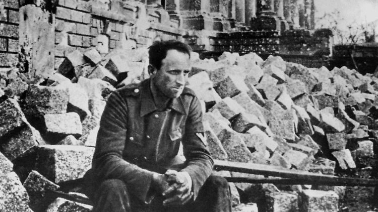 Ein gefangengenommener deutscher Soldat vor den Ruinen des Reichstages.