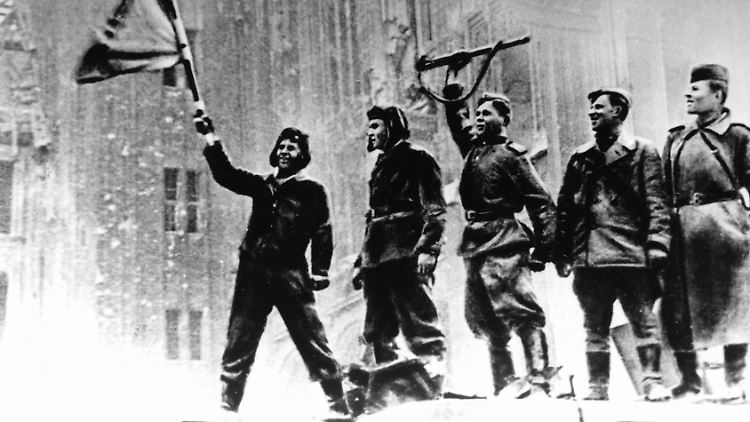 Sowjetische Soldaten hissen die rote Fahne auf dem Reichstag. Das Foto wurde einige Tage nach den Kämpfen für die Kameras nachgestellt.
