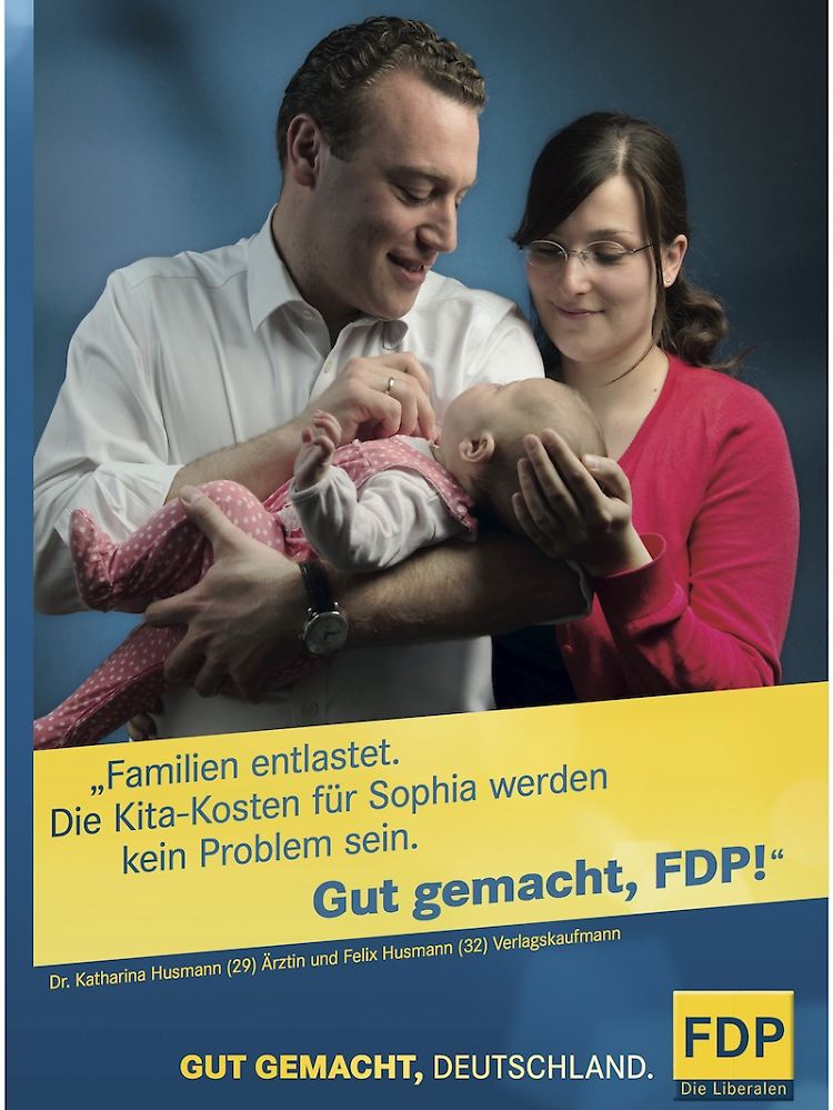 Diesem Schreckensszenario stellt der Generalsekretär dann konsequenterweise die heile Welt entgegen, die es – so die erhoffte Lesart – nur bei einer liberalen Regierungsbeteiligung geben kann. Besonders deutlich macht das ein weiteres Plakat aus der Serie, aus der auch die brüderlesche Daumen-Pose stammt. Darauf posiert eine junge Familie. Der Vater: Verlagskaufsmann, gegeltes Haar, frisch gebügeltes Hemd, Chronograf am Handgelenk. Die Mutter: Ärztin, strenger Seitenscheitel, rahmenlose Brille. Und das Baby auf den Armen der beiden: Steckt in einem rosa Strampler. Darunter steht: "Familien entlastet. Die Kita-Kosten für Sophia werden kein Problem sein. Gut gemacht, FDP!" Verquer ist daran nur: Sophias Eltern erwecken überhaupt nicht den Eindruck, als hätten sie Entlastungen nötig. Ist das gewollt? Oder nur die Folge eine Unachtsamkeit?