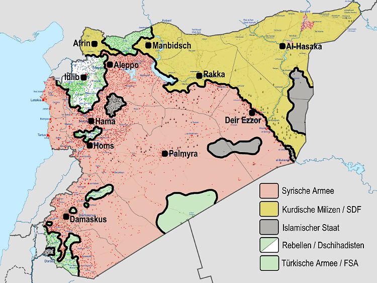 Die Maxime, Assad zu stürzen, gilt auch in Washington schon lange nicht mehr. Unter Präsident Donald Trump befand die US-Regierung, dass ihr Engagement in Syrien in einigen Bereichen nicht zielführend sei. "Vielleicht haben sie (Russland) den richtigen Ansatz, und wir den falschen", sagte US-Außenminister Rex Tillerson im Sommer vergangenen Jahres. Seither haben sich die USA darauf konzentriert, die kurdischen Milizen zu unterstützen. Tillerson kündigte erst kürzlich an, dass US-Truppen zunächst auf "unbegrenzte Zeit" im Land bleiben werden. "Die USA sind mit mindestens 2000 Soldaten auf neun Basen in Syrien im Einsatz", sagt Meyer. Die Ankündigung der USA, eine kurdische Grenztruppe mit rund 30.000 Mann aufzubauen, sei die klare Ansage gewesen: "Wir unterstützen einen kurdischen Staat." Was wiederum eine alptraumhafte Vorstellung des Nato-Partners und Nachbarn Türkei wäre. Denn dieser Staat, schätzt Meyer, "wäre aus wirtschaftlicher Hinsicht außerordentlich stark, weil er über die größten Erdgas- und Erdölvorräte verfügt und mit dem Assad-Damm nicht nur die wichtigste Wasser-, sondern auch die wichtigste Energiequelle des Landes kontrolliert".