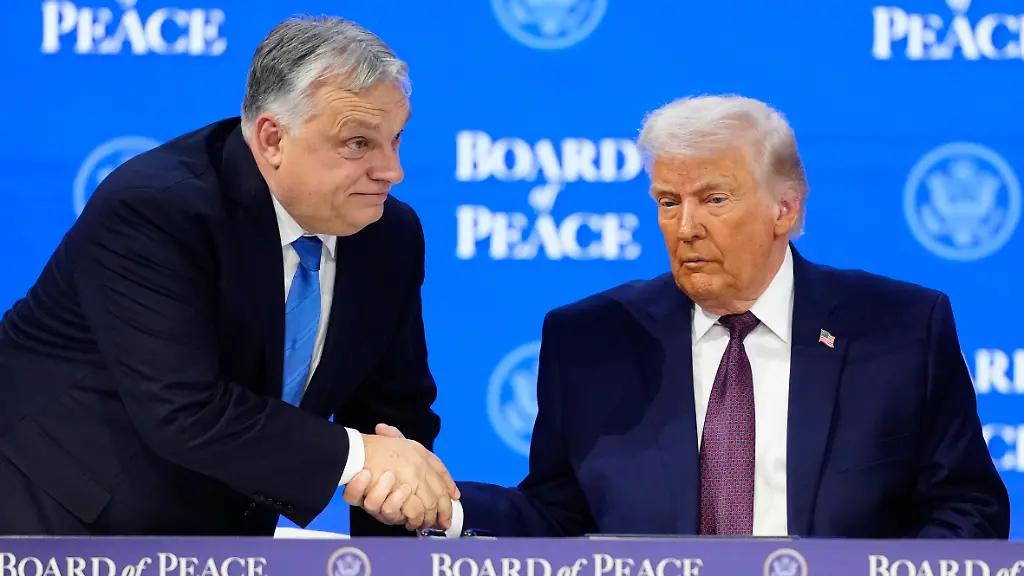President-Donald-Trump-shakes-hands-with-Prime-Minister-of-Hungary-Viktor-Orban-left-during-a-signing-ceremony-on-his-Board-of-Peace-initiative-at-the-Annual-Meeting-of-the-World-Economic-Forum-in-Davos-Switzerland-Thursday-Jan-22-2026
