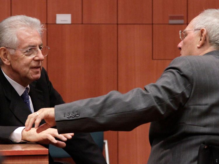 Italiens neuer Premier Monti im Gespräch mit Finanzminister Schäuble. Allein Italiens Schuldenberg hat sich auf 1,9 Billionen Euro angehäuft.