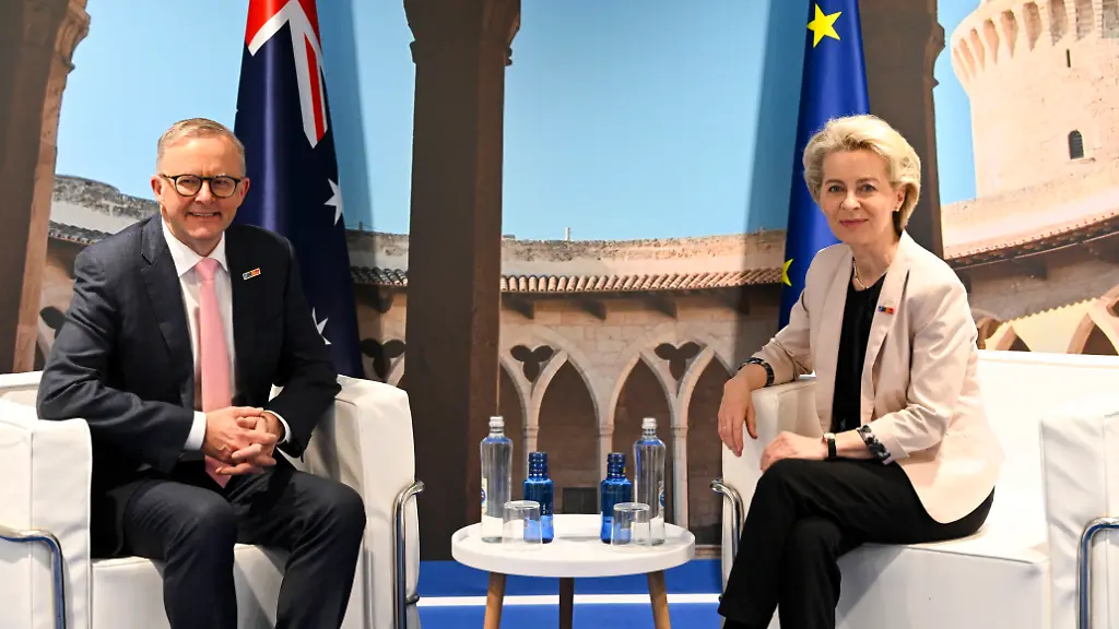Die EU und Australien haben sich darauf geeinigt, Verhandlungen über eine Sicherheits- und Verteidigungspartnerschaft aufzunehmen. "Die dauerhafte Freundschaft zwischen Europa und Australien beginnt heute ein neues Kapitel", erklärte EU-Kommissionspräsidentin Ursula von der Leyen nach einem Treffen mit dem australischen Premierminister Anthony Albanese am Rande des G7-Gipfels in Kanada. Eine solche Verteidigungspartnerschaft werde "die Tür zu gemeinsamen Beschaffungsmöglichkeiten für Verteidigungsgüter öffnen", kündigte Albanese an.