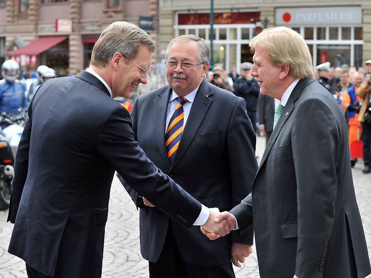 Wulff traf in Wiesbaden Hessens Ministerpräsident Bouffier. In der Mitte Landtagspräsident Norbert Kartmann.