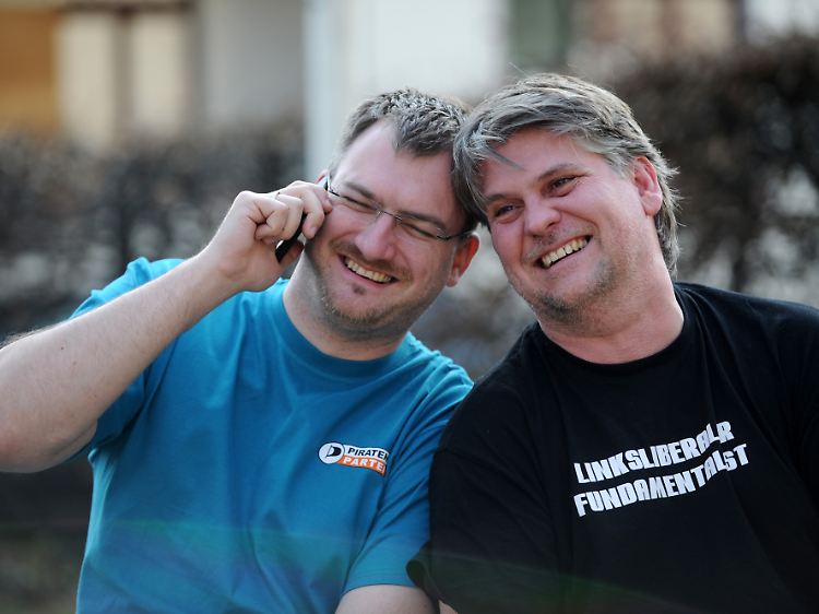 Linksliberaler Fundamentalist. Denn jenseits von Rechts-Links "ist doch bescheuert". (Das Bild zeigt Michele Marsching (l.), den Vorsitzenden der Piratenpartei in NRW, und seinen Vize Kai Schmalenbach.)