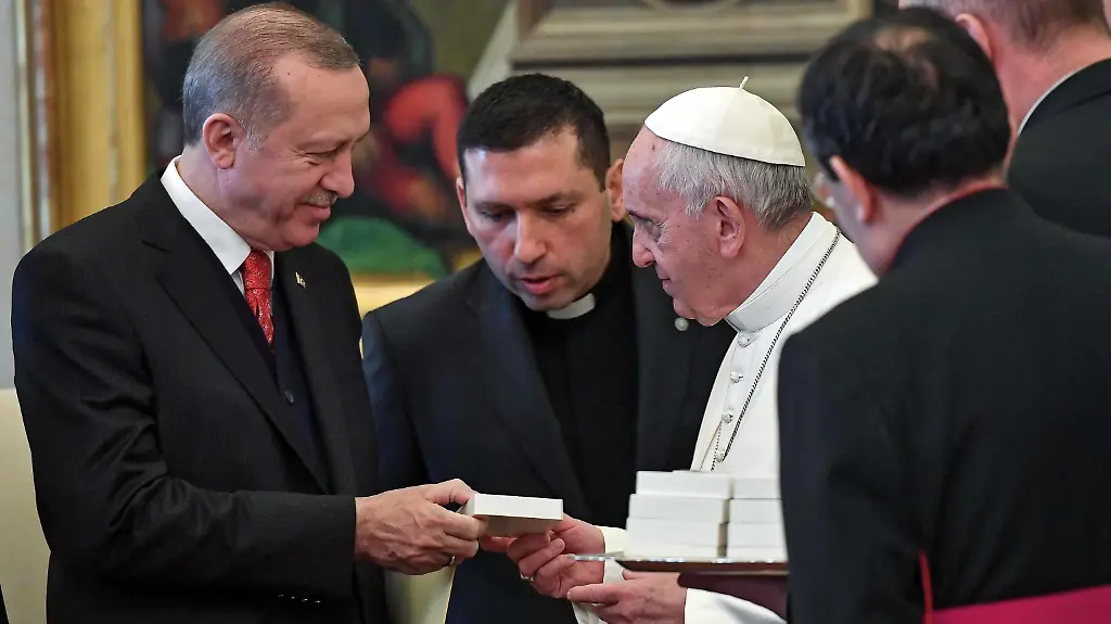 Wie so vielen seiner Besucher - darunter Bundeskanzlerin Angela Merkel oder Palästinenserpräsident Mahmud Abbas - überreichte Franziskus Erdogan eine Medaille mit einem Friedensengel. "Das ist der Engel des Friedens, der die Teufel des Krieges erwürgt", sagte der 81-Jährige zu Erdogan. "Das Zeichen für eine Welt, die auf Frieden und Gerechtigkeit basiert." Erdogan bedankte sich auf Italienisch.