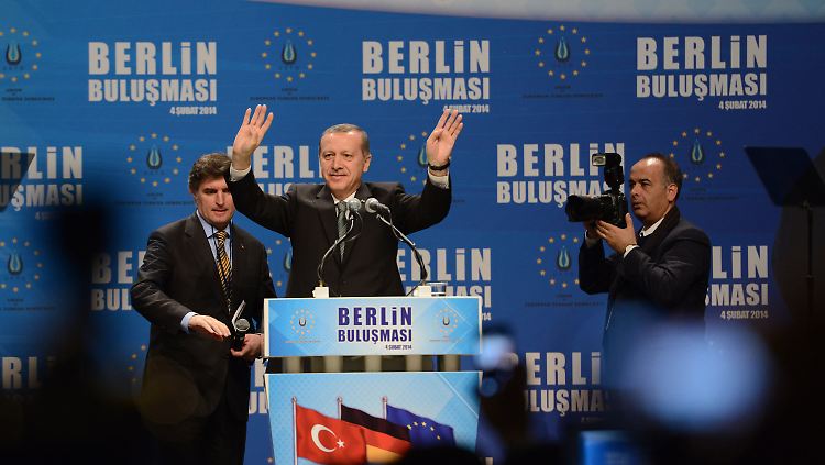Er bekommt dann doch noch seinen Wohlfühlauftritt in der Fremde: Nach einem ziemlich enttäuschenden Nachmittag bei der deutschen Regierung lässt sich der türkische Ministerpräsident vor rund 4000 Anhängern mitten in Berlin feiern. Die Union Europäisch-Türkischer Demokraten, eine Lobby-Organisation der AKP mit Sitz in Köln, hat Recep Tayyip Erdogan eine prächtige Wahlkampfbühne bereitet. Und der Staatsmann nimmt die Gelegenheit gerne wahr. Im März stehen Kommunalwahlen an, im Sommer wird ein neuer Präsident gewählt - bei letzterem Urnengang dürfen erstmals auch in Deutschland lebende Türken abstimmen.