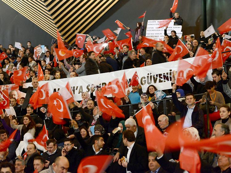 Dass Erdogan Provokationen sein lässt, heißt jedoch nicht, dass er keine selbstbewusste Ansprache hält. Erdogan liebt große Massen, er genießt das auch an diesem Abend. Das türkische Fernsehen überträgt live. Mit über einstündiger Verspätung betritt der "große Meister", wie ihn sein Stellvertreter ankündigt, die Bühne. Und der legt das Pathos an den Tag, das er so gut beherrscht. "Seid bitte stolz", ruft er den Exiltürken zu. Deutschland zähle ebenso wie die Türkei zu den größten Ländern der Welt. "Ihr solltet stolz darauf sein, hier zu arbeiten und die Fahne der Türkei zu tragen."